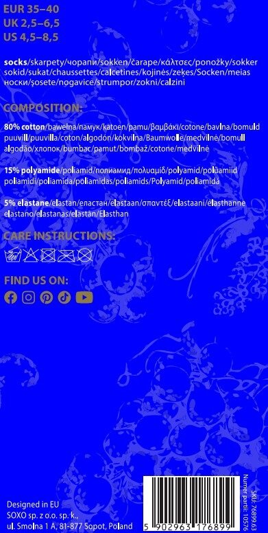 Štýlové ponožky SOXO sú vyrobené z mäkkej na dotyk a elastickej prírodnej bavlnenej tkaniny. Sú módne, pohodlné a príjemné na nosenie. SOXO je dokonalá kombinácia potešenia a funkčnosti, ktorú si zamilujete už od prvého obutia!