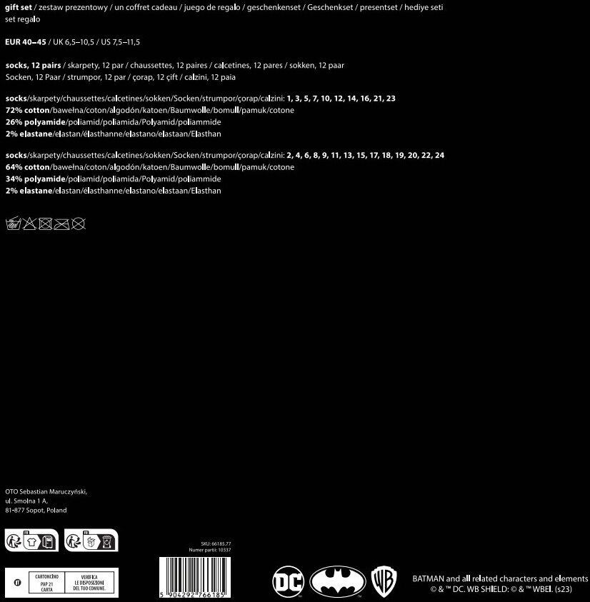 Sada 12 párov farebných Batmanových ponožiek v podobe adventného kalendára. Vyrobené z kvalitného materiálu vám zaistia pohodlie. Môžete ich obdarovať na Mikuláša alebo Vianoce. Prekvapivé balenie a ponožky sú perfektnou kombináciou.