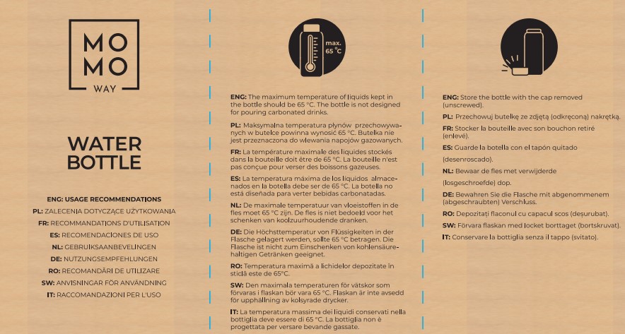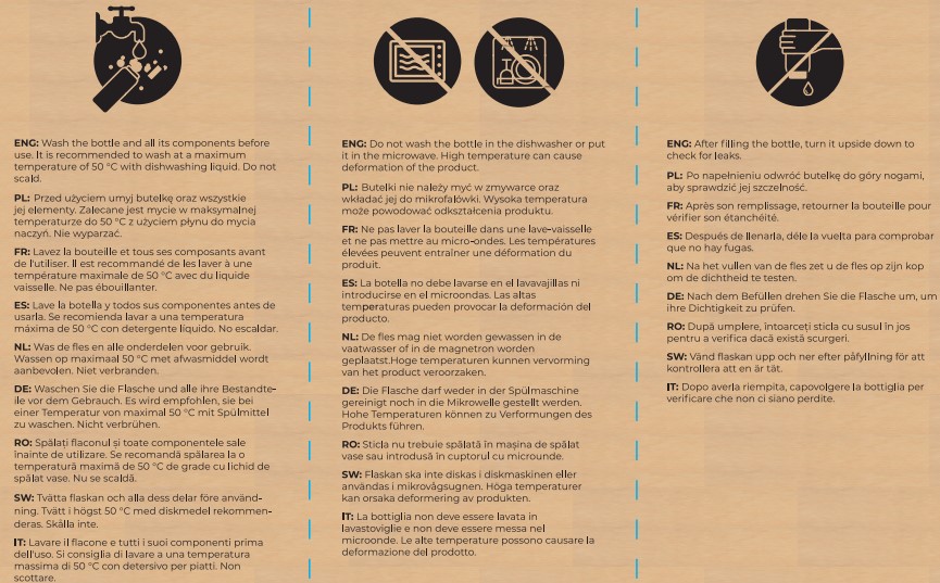 Fľašu neumývajte v umývačke riadu a nevkladajte do mikrovlnnej rúry. Vysoká teplota môže spôsobiť deformáciu produktu.